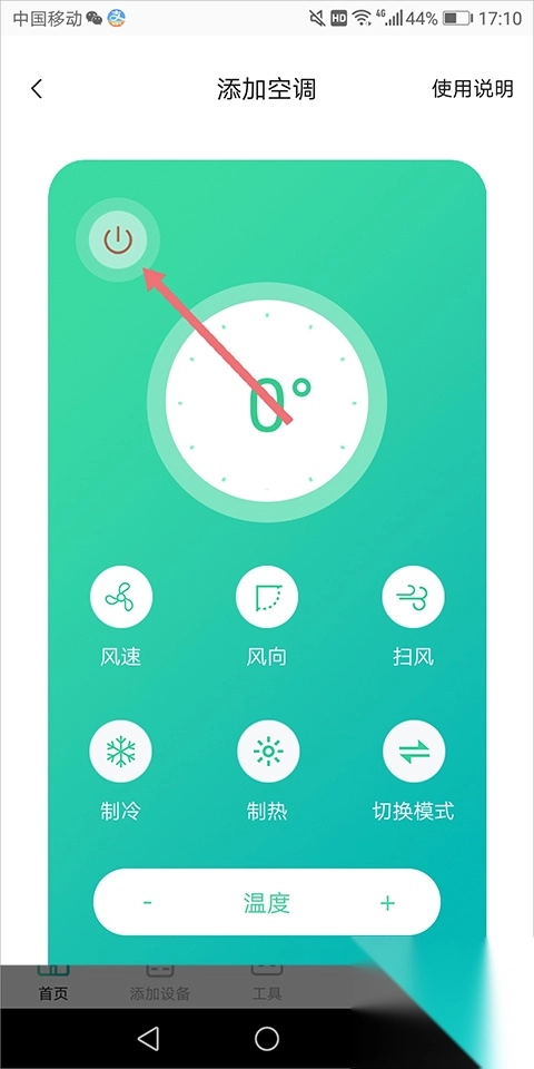 5、选择好后软件直接进入该设备的遥控页面中,用户点击该页面左上角的电源键(下图红色箭头所指)
