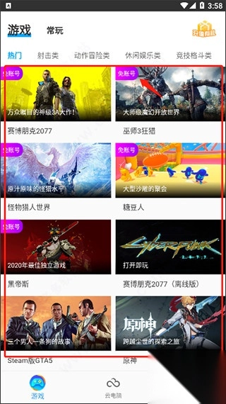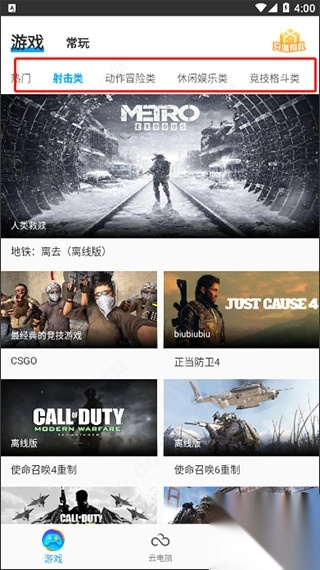 2、同时其中主要划分了射击类、动作冒险、休闲娱乐等种游戏,可根据需求自由挑选体验;
