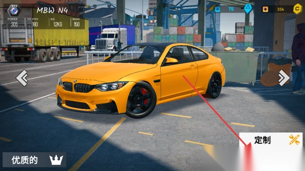 2、在车库选黄色【MBW N4】车,看属性(Power),点【玩】,可【定制】升级,提升性能。
