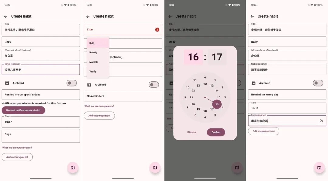 1. 按照需求设定习惯名称、打卡频率以及提醒方式,同时支持添加地点备注。
