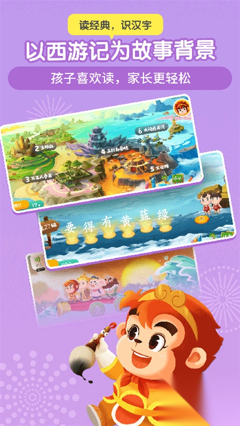 以广受孩子喜爱的经典名著西游记为故事背景,在孩子喜爱西游记的同时,感受国学名著魅力,不知不觉的掌握汉字。