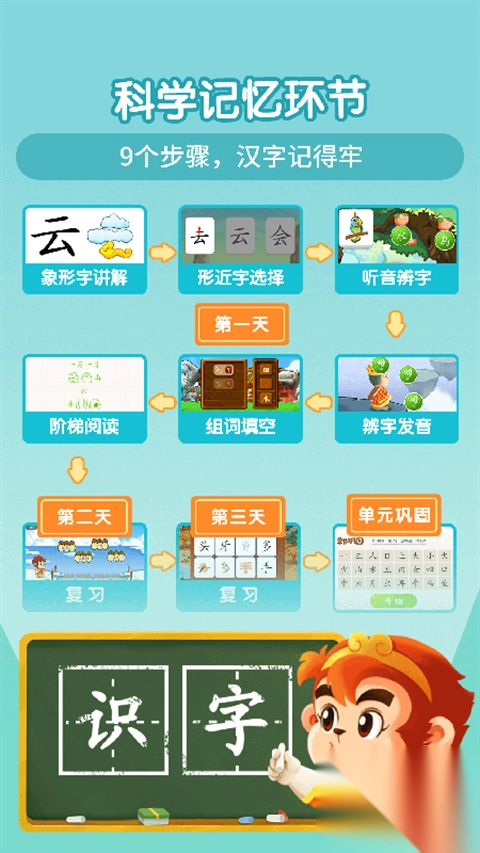 根据科学的儿童记忆特点设计课程。每个汉字通过9大步骤,来帮助孩子进行巩固记忆,掌握汉字。