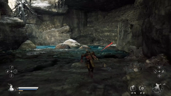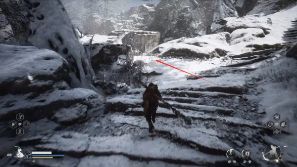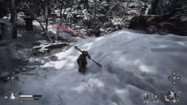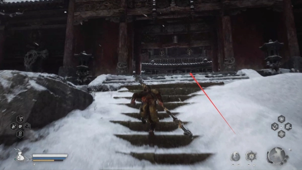 10、返回至刚才的路口,继续向前,爬坡通过阶梯,进如院内,即可遇见赤尻马猴BOSS。
