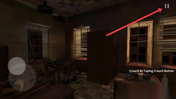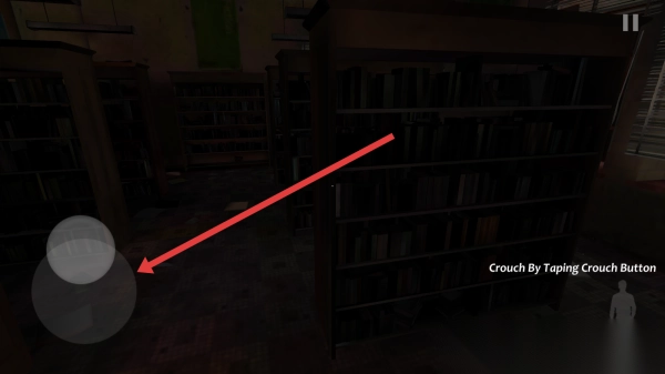 2、在游戏过程中,通过拖动左侧的虚拟摇杆,能够控制角色在图书馆内移动。按照提示“Crouch-By-Taping-Crouch-Button”操作,就可以让角色蹲下进行躲避。
