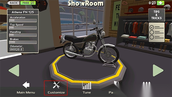 1、启动游戏,进入摩托车界面,点击下方的customize(你这里cystomize疑似拼写错误,应为customize) 。