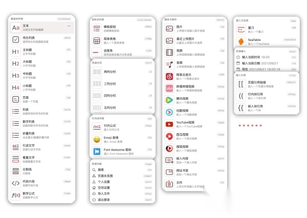 下方是/目前可以唤起的所有内容类型和功能。它们后面均有快捷键显示(你将这些字母直接替换成中文也是一样的):