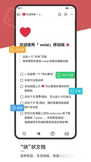 我来 wolai 苹果版,是上海我云网络科技有限公司精心打造的一款云端协同笔记应用。它既能满足个人使用 wolai 进行笔记记录,又对团队协作助力颇多。在如今信息爆炸的时代,收集和梳理有价值的信息至关重要。对比市面上众多笔记应用,这款软件最突出的亮点,便是好用与好看。在当下“颜值即正义”的时代,美观的重要性不言而喻,而好用同样关键。要使用 wolai 笔记,首先得了解其基础单位——block(块)。无论是输入的文本、页面、代码片段、数学公式,还是图片、音频等,都会形成一个独立的 block 。针对单个 block 能够自由操作,这极大地提升了个人规划安排以及团队协同工作的效率。不仅如此,你还能自由布局,只要创意够丰富,各种排版都能塑造你的布局美学。