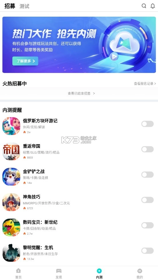2. 抢先加入更多腾讯游戏内测,最新最快: 作为内测游戏的首选平台,您可以率先体验到最新游戏的魅力,抢先一步掌握游戏的精彩内容,成为游戏世界的先锋。