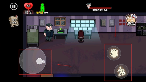 2、左侧屏幕控制角色移动方向,右侧设置攻击与互动按钮,遇到可疑人物时可调查或使用武器进行自保。