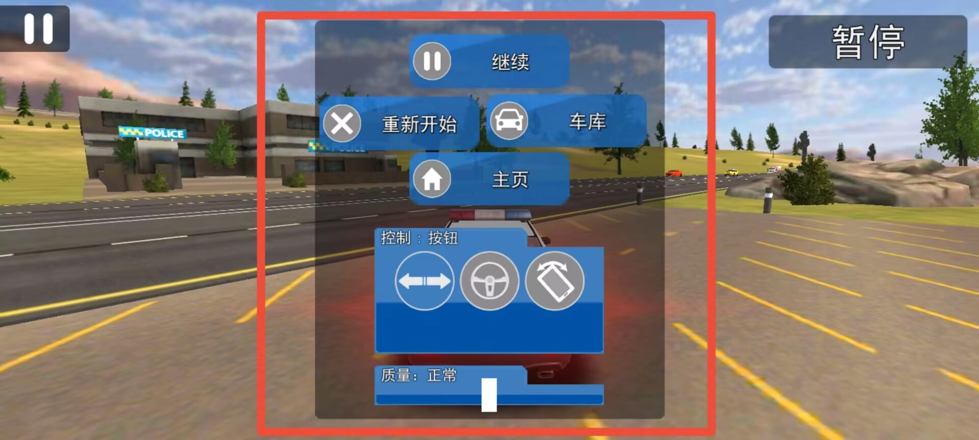 3、暂停菜单包含游戏重启、主界面返回及操控设置等选项,可调整转向灵敏度与画面显示效果等参数。