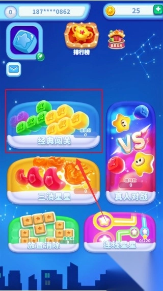 1、进入游戏后,第一步要选择游戏模式,目前有经典闯关、三消星星、真人对战、放置消除、连线星星等多种玩法。