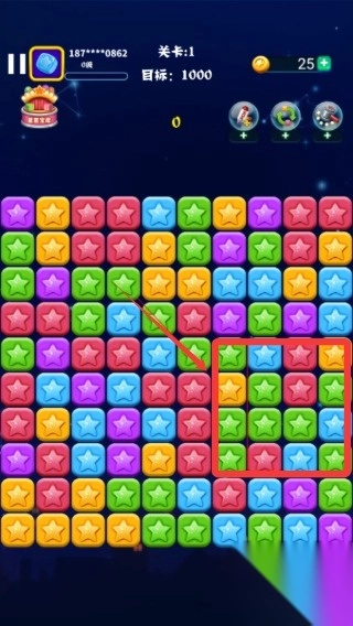 1、进入关卡后,观察星星分布,通过点击连接两个或以上同色星星进行消除,当连接越长,可获得的分数与奖励道具也越丰厚。