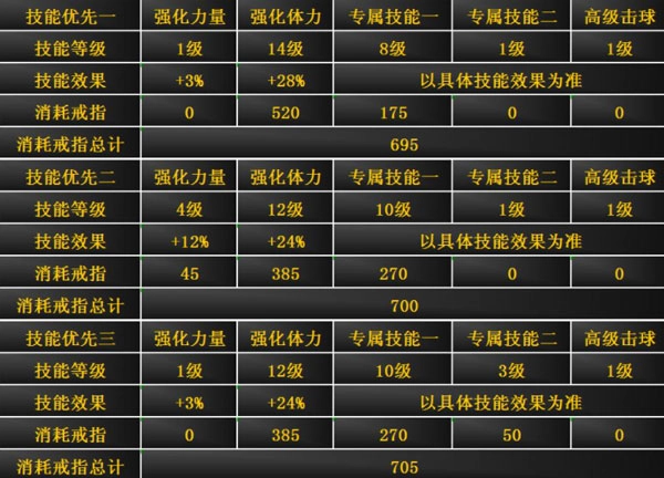 下面我以集中升级一个人物,且使用700个戒指为例,给大家提供一些技能升级建议,仅作参考,大家可依据自身实际情况适度调整。