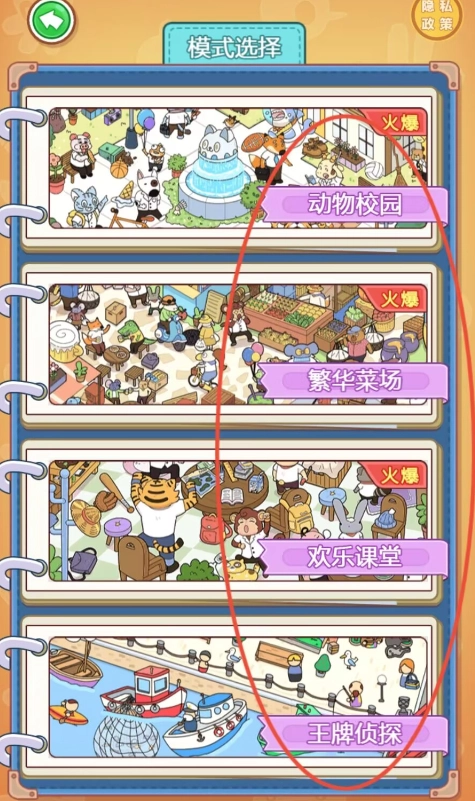 1. 游戏主界面设置了模式选择入口,其中涵盖动物校园、繁花菜市场等众多主题场景,玩家只需点击对应的卡片,就能载入相应的玩法内容。
