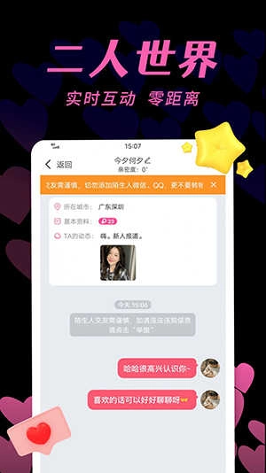 3、和潜在的朋友或者约会对象开展实时聊天,不管在什么时间什么地点都能保持联络,让彼此之间的了解更深入。