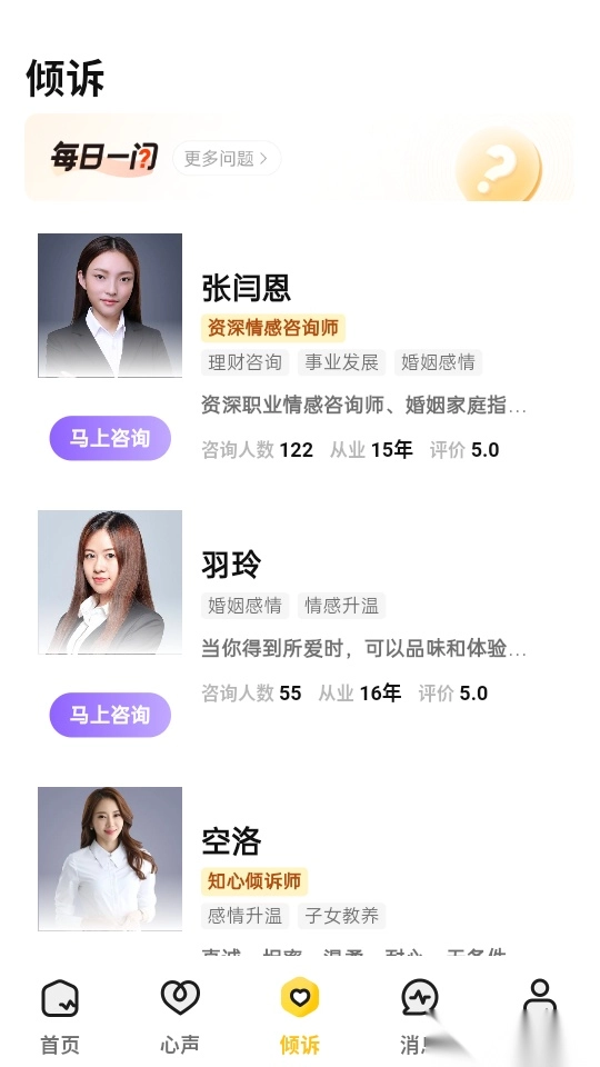 还汇集了海量的咨询师,这里更多的情感咨询师都可选择,满足不同用户的咨询需求。