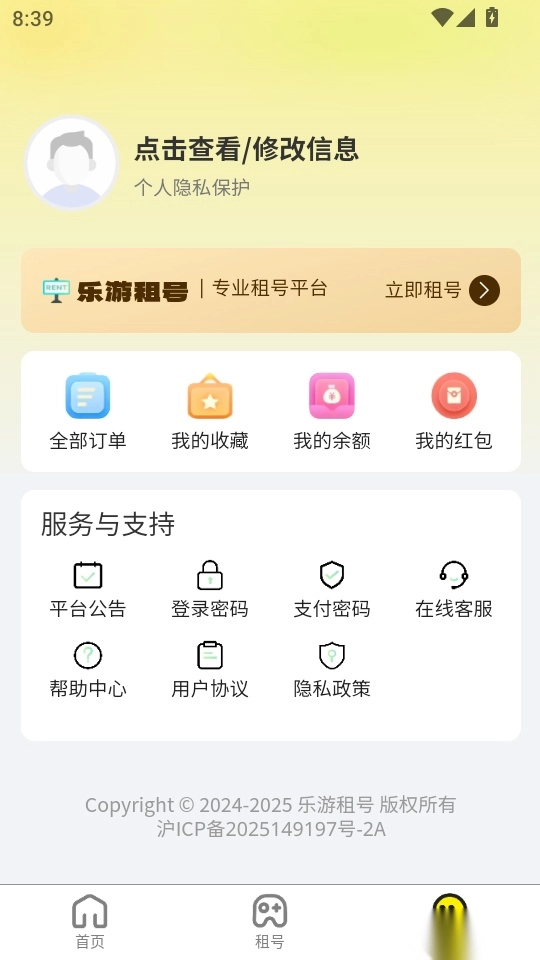 乐游租号是一款集游戏账号租赁与云游戏流畅体验于一体的应用,平台聚合了全网海量热门游戏账号租赁资源,各类特价账号支持一键快速租玩,所有账号均为真实提供,绝无虚假租赁信息;软件配备全天在线客服,可及时协助租号用户解决各类咨询问题;此外,乐游租号最新版本还设有签到福利、充值红包、登录奖励等福利内容,丰富的特色活动与福利机会值得把握;感兴趣的用户可前往本站直接体验这款应用。