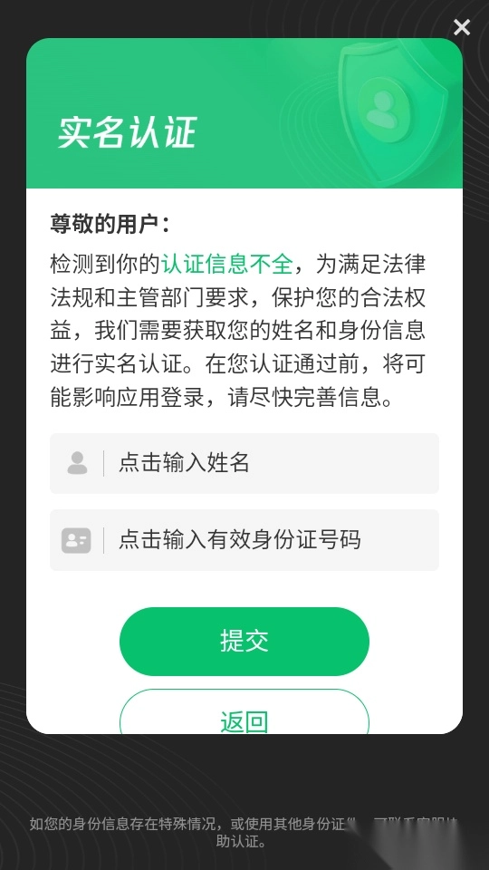 之后会弹出“实名认证”的窗口界面,填写相关信息并点击“提交”按钮,即可进入后续流程。