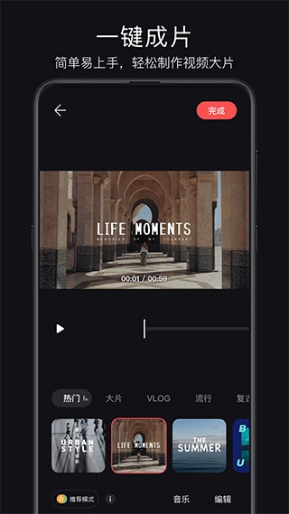 核心的“一键成片”功能极大简化了视频制作流程,用户只需上传素材并点击该功能按钮,系统便会自动完成剪辑、配乐以及特效添加等步骤,整个过程耗时较短,能很好地适配手机用户碎片化的创作需求。