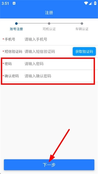 在设置密码并再次输入确认后,点击下一步,完成注册流程。