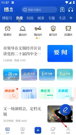 1、启动无锡博报应用,在首页找到并点击“我的”选项,即可进入个人中心页面。