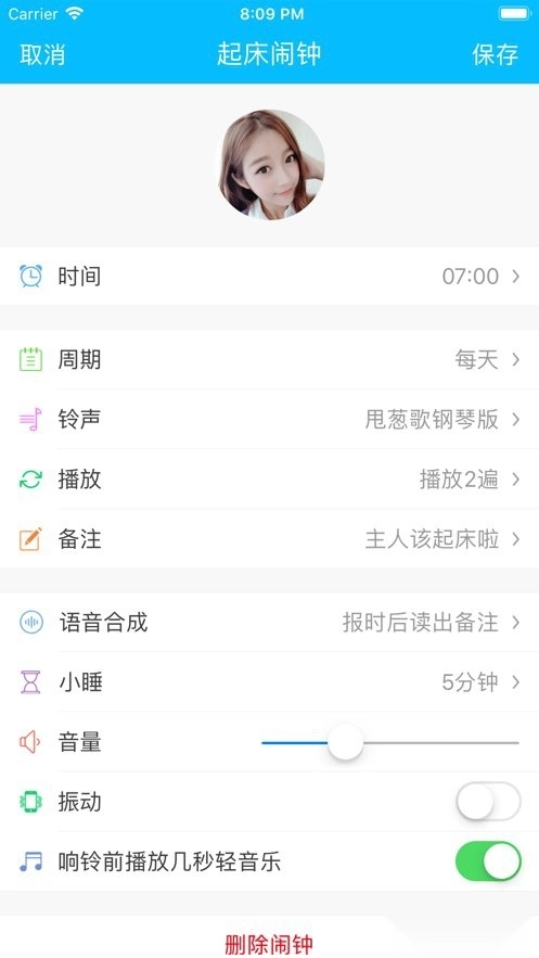 这是一款带音乐闹铃功能的提醒软件,不仅有各种可爱、好听又霸气的萌妹子或靓仔语音,涵盖多种角色,声音甜美、音质清晰,还有悦耳的真人语音铃声可供选择,当然您也可以用喜欢的歌曲来设置铃声。