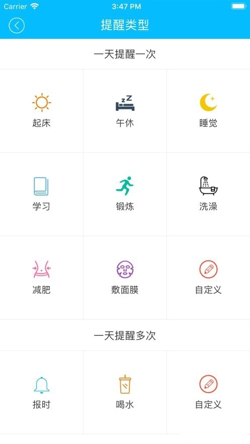 提醒类型涵盖起床、报时、午休、睡觉、学习、喝水提醒等多种类别。