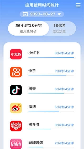 1、应用使用时间统计:朝暮时长管家会详细记录您手机里各个应用的使用时长与启动频次。借助直观清晰的统计数据,您能清楚知晓自己在不同应用上投入的时间,进而更有效地管理和调整自身的应用使用习惯。合理规划时间分配,将精力集中在重要任务上,提升工作与学习的效率。