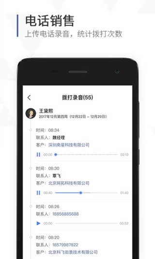 3、电话销售管理:支持PC端一键拨号,同步实现电话录音、通话数据统计、电话排行榜展示及客户跟进计划制定,推动CRM系统与电话机深度融合,助力企业全面掌握员工通话数据,优化沟通话术策略,有效提升销售业绩。