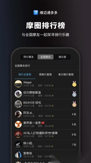 7. 摩圈具备骑行数据全国排行、共同骑行车友排行、俱乐部排行等功能。