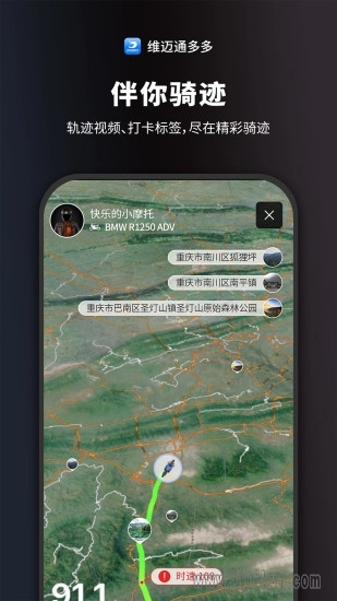 这是一款专为摩托车车主设计的骑行应用,摩托车车队对讲功能、骑行轨迹记录与排行榜系统。在跟随界面中,车友的实时位置清晰呈现,距离显示直观明了;通过装备适配与车型优化,让骑行体验更添乐趣。