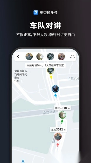 1. 车队对讲的【跟随】功能完成全新升级,车友的实时位置动态更新,彼此距离显示更直观清晰,让骑行过程更省心、更轻松;