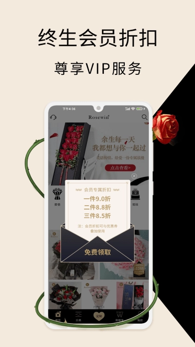 4、【优惠畅享】在rosewin鲜花,随时随地都能查看最新活动资讯,畅享最优优惠。