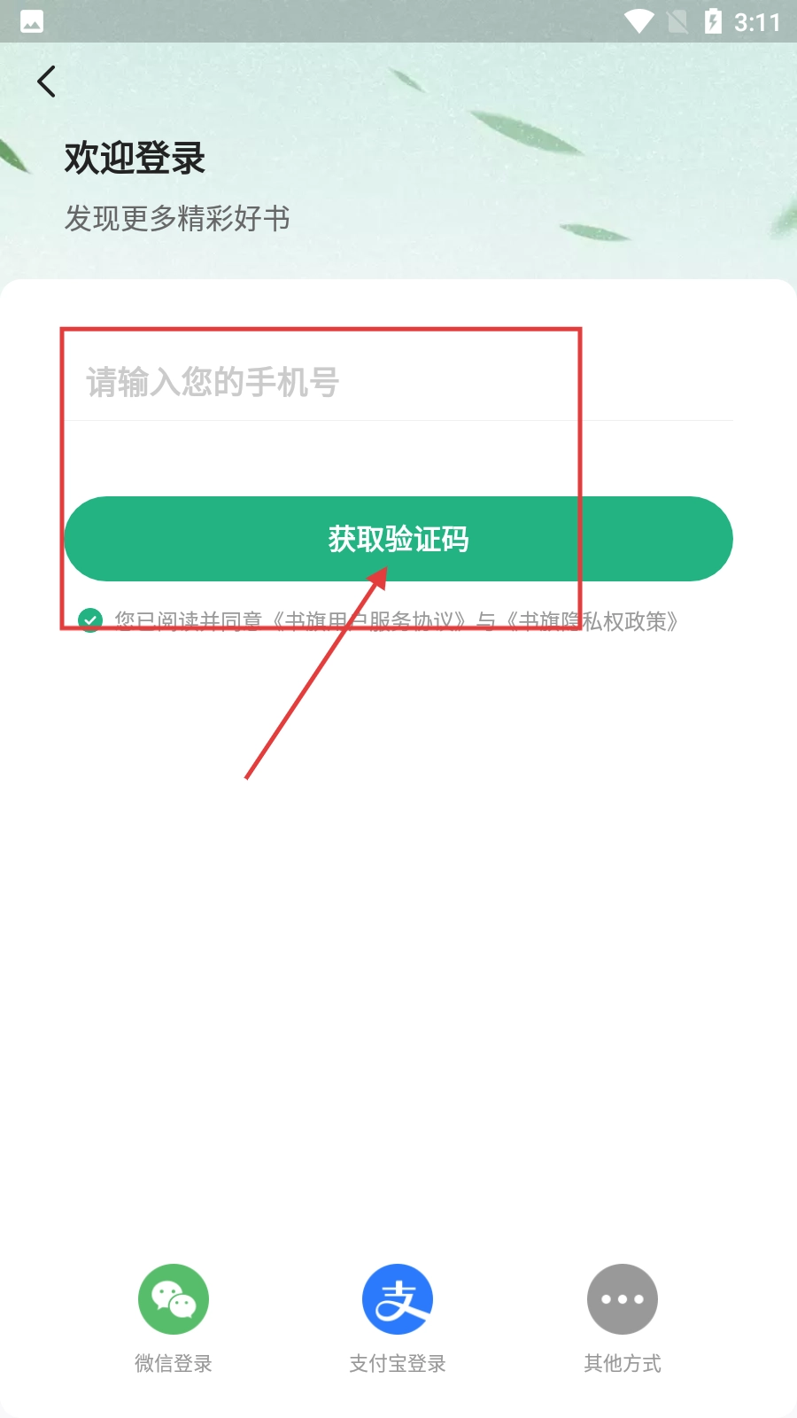 3、于登录界面输入手机号码,勾选已阅读并同意相关协议,随后点击【获取验证码】。