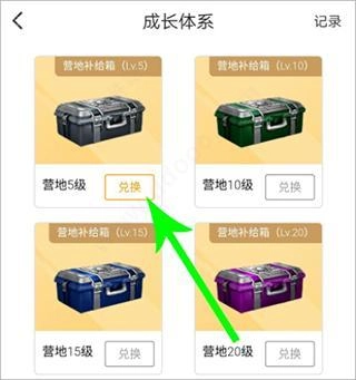 2、还有就是大家可以进入和平营地个人中心界面,点击头像旁边的“等级”,就可以进入成长体系界面了,切换到营地特权,然后将营地特权页面向上滑,可以看到这里有营地补给箱,大家达到一定的等级就可以兑换这些补给箱了。