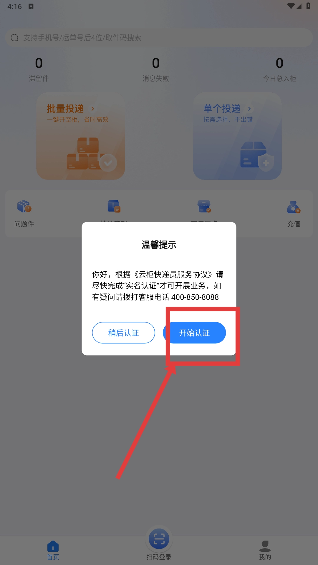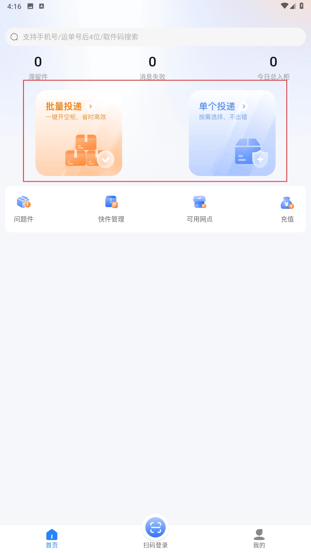 认证完成后,在首页找到并点击【批量投递】功能选项,即可通过一键操作开启空柜来处理快件。