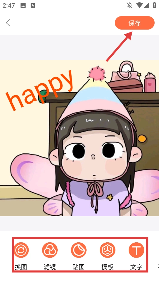 4、借助【换图】【滤镜】【贴图】【模板】【文字】这些功能开展创作,全部完成后点击右上角的【保存】按钮,就能结束DIY头像的制作流程啦。