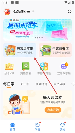 1、点击【英文绘本馆】选项,进入绘本馆页面。