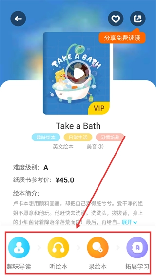 4、进入绘本详情页后,可选择【趣味导读】【听绘本】等功能,完成绘本学习操作。
