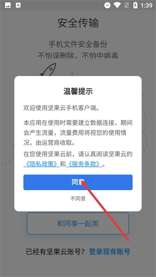 1、使用坚果云手机客户端前,需阅读并同意《隐私政策》和《服务条款》,点击【同意】方可继续使用。