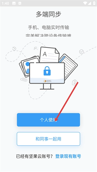 2、进入多端同步界面后,根据需求选择【个人使用】或【和同事一起用】,已有账号可点击【登录现有账号】。