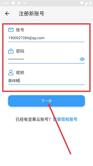 3、在注册新账号页面,填写邮箱账号、设置密码并输入昵称,完成后点击【下一步】。