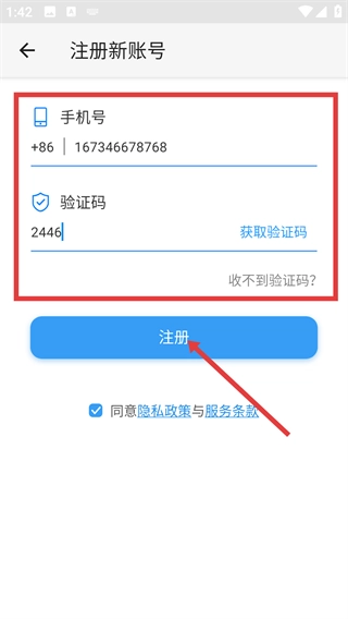 4、输入手机号并获取验证码,填入后勾选同意隐私政策与服务条款,点击【注册】完成账号注册。