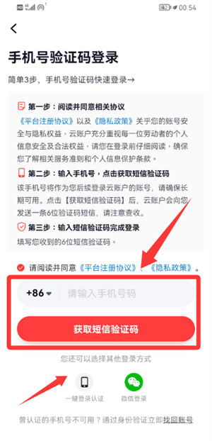 2、接下来在登录页面填入手机号,点击获取短信验证码以完成验证。