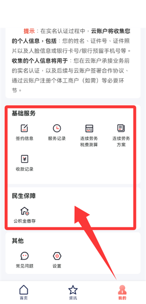 4、接着切换到“我的”页面,查看基础服务、民生保障等功能。
