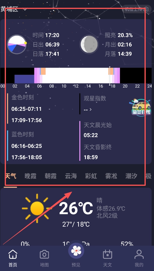 2、在首页或预见页面,你可以查看当天详细的天气、日出日落时间,以及金色时刻和蓝色时刻的具体时段。