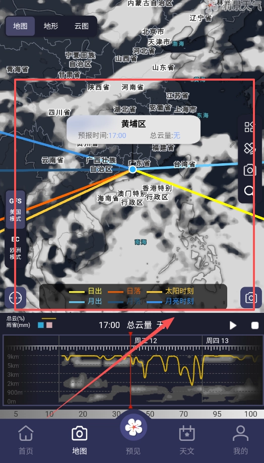 3、切换到地图页,选择地图或卫星模式,能查看全国云量、雨雪分布,拖动地图到想去的地区。