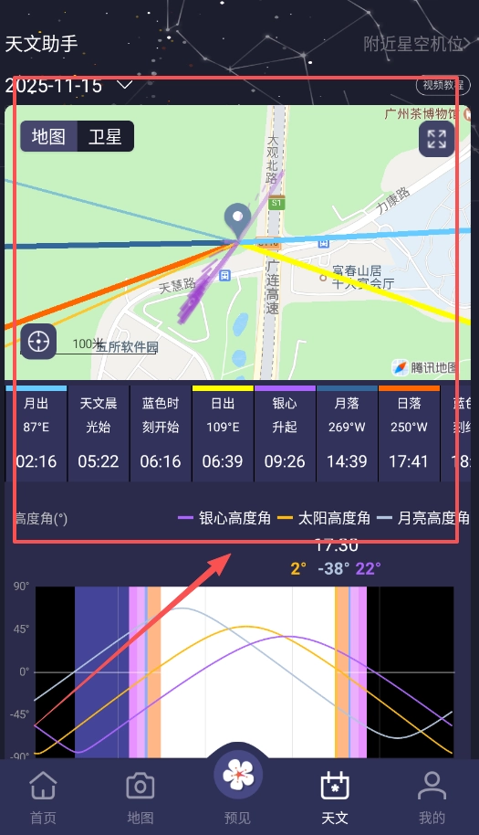 4、进入天文助手界面,可以查看月出、银心升起等具体天文事件时间,以及太阳和月亮的高度角,轻松安排星空摄影计划。