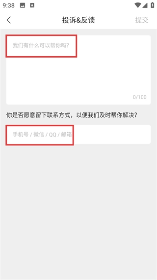 3、进入投诉&反馈页面后,首先在输入框中填写反馈内容,接着根据自身需求填写联系方式,至此完成信息准备工作。