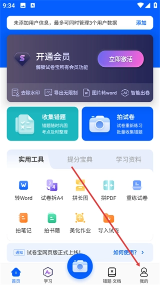 1、在试卷宝首页点击底部的【我的】选项,就能进入个人中心页面,在这个页面可以查看各类功能入口以及和个人相关的选项。